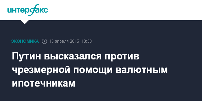 Москва. 16 апреля. INTERFAX.RU – Помощь заемщикам по валютной ипотеке не должна быть больше, чем заемщикам по аналогичным кредитам в рублях, считает президент Владимир Путин.