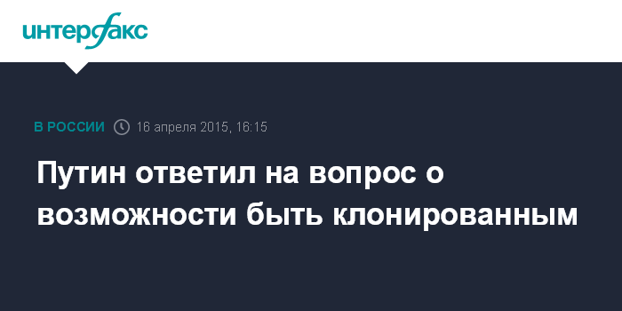 Вопрос о клонировании задали Путину в конце "прямой линии" в ряду коротких блиц-вопросов. Глава государства ответил на него так же коротко: "Нет". Точно такой же ответ он дал на вопрос, не хотел бы он в будущем стать генсеком ООН.