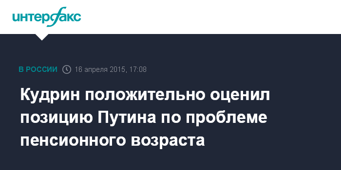 Москва. 16 апреля. INTERFAX.RU - Экс-министр финансов Алексей Кудрин назвал позитивным сигналом мнение президента РФ Владимира Путина о том, что к вопросу повышения пенсионного возраста можно вернуться в будущем, но тщательно его проработав.
