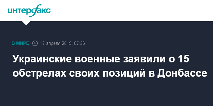 Москва. 17 апреля. INTERFAX.RU - Украинские военные утверждают, что с 18:00 до полуночи четверга ополченцы 15 раз нарушили режим прекращения огня, в том числе дважды открывали огонь в направлении населенных пунктов.