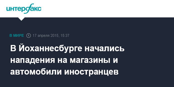 Москва. 17 апреля. INTERFAX.RU - Несколько магазинов и автомобилей, принадлежащих иностранцам, сожжены в южноафриканском городе Йоханнесбург, сообщает в пятницу агентство AP.