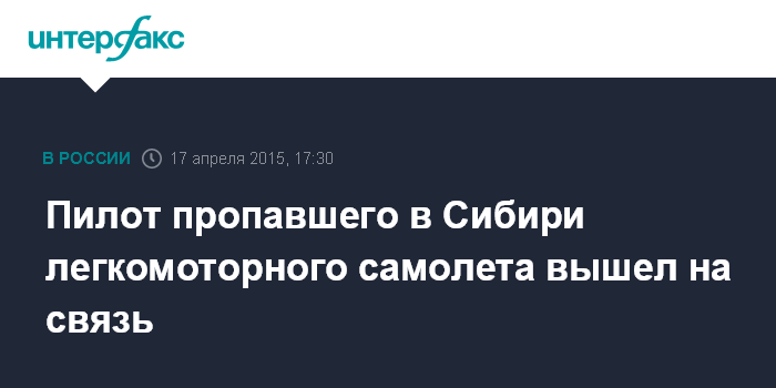 Москва. 17 апреля. INTERFAX.RU - Пилот частного легкомоторного самолета Skyranger, который считался пропавшим без вести в Красноярском крае, вышел на связь, сообщила агентству "Интерфакс" сотрудник пресс-службы ГУ МЧС России по Красноярскому краю Елена Ястребкова.