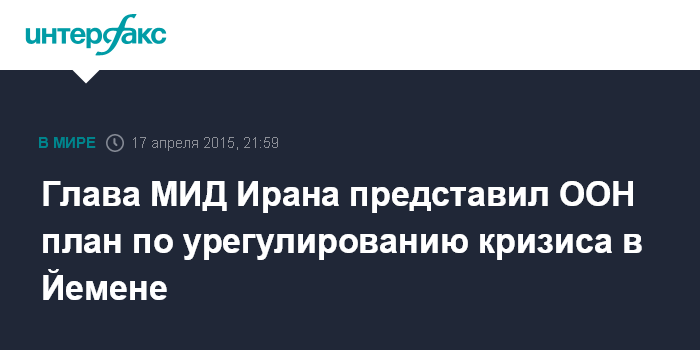 Москва. 17 апреля. INTERFAX.RU - Глава МИД Ирана Джавад Зариф направил генсеку ООН Пан Ги Муну письмо с изложением плана из четырех пунктов по решению кризиса в Йемене, сообщает в пятницу сайт ливанского издания Daily Star.