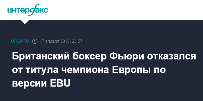 Москва. 18 апреля. INTERFAX.RU - Британский супертяжеловес Тайсон Фьюри оставил вакантным титул чемпиона Европы по версии EBU, сообщил сайт boxingscene.