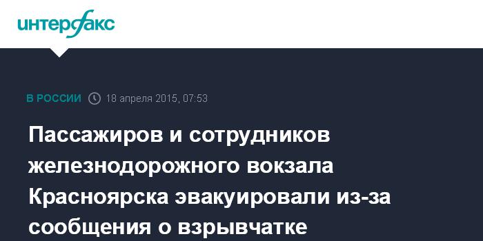 По данным компании, в субботу в 5:15 местного времени (1:15 по Москве) поступил анонимный телефонный звонок о том, что на железнодорожном вокзале станции Красноярск заложено взрывное устройство.