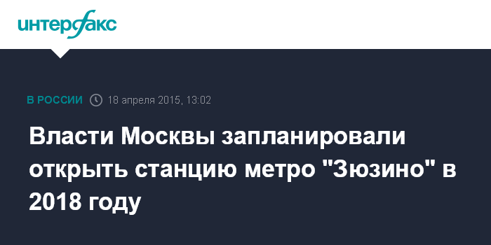 Москва. 18 апреля. INTERFAX.RU - Станцию "Зюзино" второго кольца метро планируется открыть в 2018 году, сообщил журналистам в ходе субботнего объезда заместитель мэра Москвы по вопросам градостроительной политики и строительства Марат Хуснуллин.