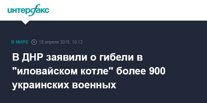 Москва. 19 апреля. INTERFAX.RU - В окружении под Иловайском погибло более 900 украинских военных, заявила в воскресенье представитель Комиссии самопровозглашенной Донецкой народной республики по делам военнопленных Лилия Родионова.