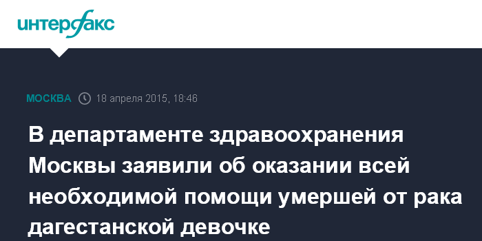 Москва. 18 апреля. INTERFAX.RU - Глава департамента здравоохранения Москвы Алексей Хрипун выразил соболезнования родным скончавшейся от рака дагестанской девочки, и подчеркнул, что ей была оказана вся необходимая медицинская помощь.