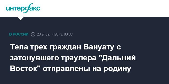 Москва. 20 апреля. INTERFAX.RU - Тела трех погибших граждан Вануату с затонувшего в Охотском море траулера "Дальний Восток" в воскресенье вечером были отправлены чартерным рейсом в Австралию, сообщили агентству "Интерфакс" в представительстве МИД РФ в Южно-Сахалинске.