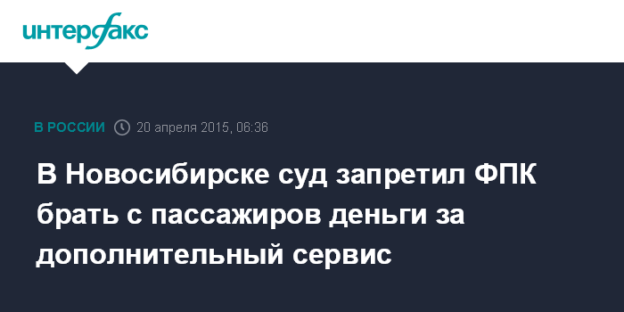Москва. 20 апреля. INTERFAX.RU - Железнодорожный районный суд Новосибирска по иску Новосибирского транспортного прокурора запретил Федеральной пассажирской компании взимать с пассажиров стоимость дополнительных сервисных услуг, сообщает Западно-Сибирская транспортная прокуратура.
