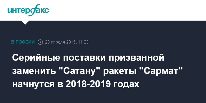 Москва. 20 апреля. INTERFAX.RU - Разработка тяжелой жидкостной межконтинентальной баллистической ракеты (МБР) "Сармат", которая должна в перспективе заменить ракеты РС-20В "Воевода" (по SS-18, "Сатана"), идет успешно, серийные поставки начнутся до 2020 года, сообщил "Интерфаксу" заместитель министра обороны Юрий Борисов.