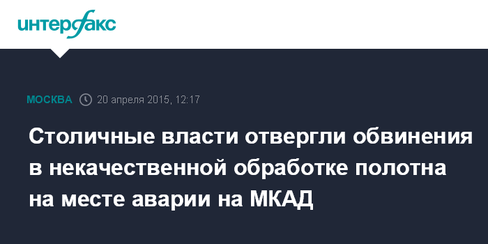 Москва. 20 апреля. INTERFAX.RU - Столичные власти опровергают информацию некоторых СМИ о том, что причиной серьезного ДТП с человеческими жертвами на МКАД стал гололед.