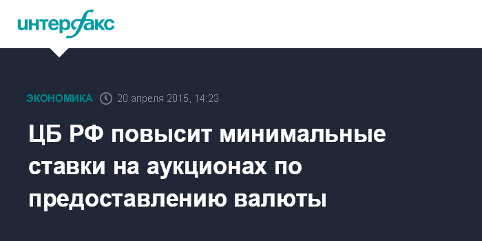 Москва. 20 апреля. INTERFAX.RU – Банк России, учитывая изменение конъюнктуры валютного рынка, принял решение с 21 апреля 2015 года увеличить минимальные ставки на аукционах по предоставлению иностранной валюты, говорится в сообщении регулятора.