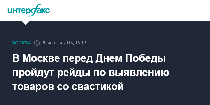 Москва. 20 апреля. INTERFAX.RU - Московские власти перед Днем Победы планируют провести рейды по выявлению товаров со свастикой и другой экстремистской символикой. Об этом M24.ru рассказал начальник отдела информационных программ управления по антитеррористической деятельности Вячеслав Попов.