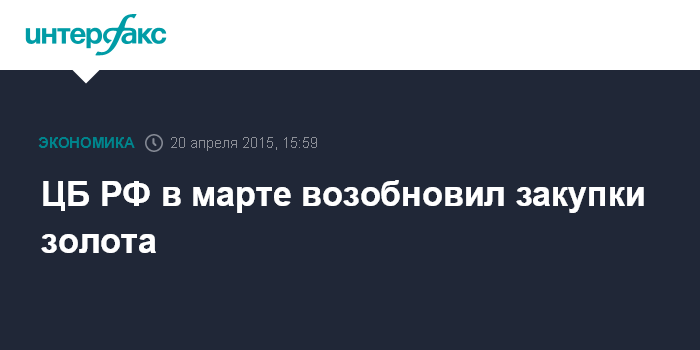 Москва. 20 апреля. INTERFAX.RU – Банк России в марте 2015 года закупил 1 млн тройских унций (около 31 тонны) золота, следует из материалов ЦБ. В январе-феврале 2015 года ЦБ РФ золото не закупал, хотя в течение всего 2014 года закупки были активные.