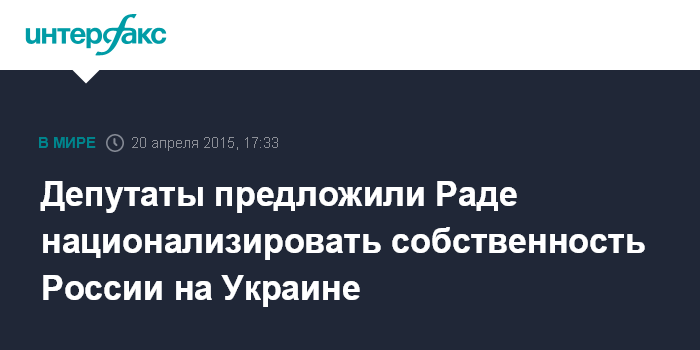 Москва. 20 апреля. INTERFAX.RU - В Верховной раде Украины зарегистрирован проект закона, предполагающий национализации имущества Российской Федерации и ее резидентов.