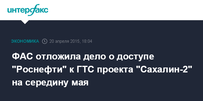 Москва. 20 апреля. INTERFAX.RU - Федеральная антимонопольная служба (ФАС) России в очередной раз отложила рассмотрение дела, касающегося доступа "Роснефти" к газотранспортной системе проекта "Сахалин-2", на этот раз на середину мая.