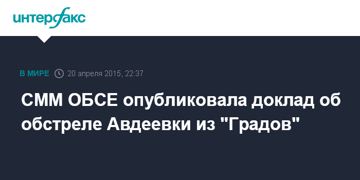 Москва. 20 апреля. INTERFAX.RU - Специальная мониторинговая миссия (СММ) ОБСЕ в понедельник вечером опубликовала доклад об обстреле города Авдеевка в Донецкой области Украины. Специалисты Миссии установили, что город был обстрелян из ракетных систем залпового огня "Град".