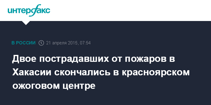 Москва. 21 апреля. INTERFAX.RU - Двое мужчин умерли в красноярском ожоговом центре от полученных ожогов в результате пожаров в Хакасии, сообщила "Интерфаксу" пресс-секретарь красноярской краевой больницы Ирина Кочеткова.