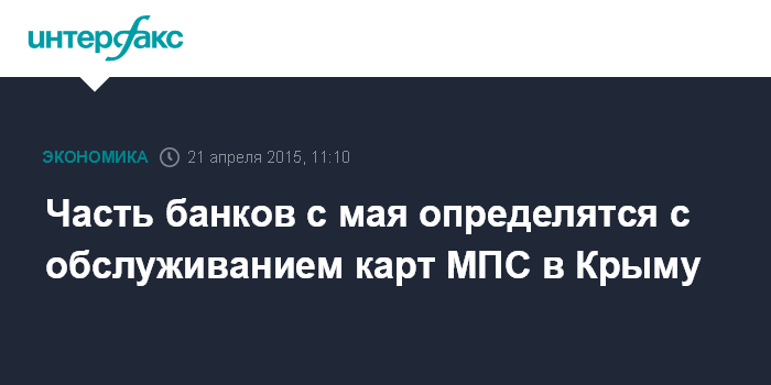 Москва. 21 апреля. INTERFAX.RU – В апреле-мае часть российских банков могут принять решение о начале обслуживания карт международных платежных систем (МПС) в Крыму, сообщила зампред ЦБ РФ Ольга Скоробогатова на конференции "Банковские карты: практика и трансформация" во вторник.