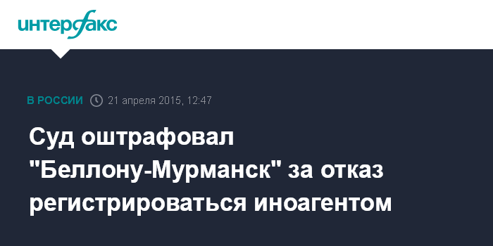 Москва. 21 апреля. INTERFAX.RU - Мировой суд в Мурманске оштрафовал региональную общественную экологическую организацию "Беллона-Мурманск" за отказ регистрироваться в качестве иностранного агента, сообщила "Интерфаксу" представитель организации Анна Киреева.