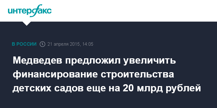 "С детскими садами реально стало лучше, и я считаю, что мы можем занести себе это в актив. Поэтому предлагаю увеличить финансирование строительства детских садов прямо сейчас еще на 20 млрд в этом году", - сказал Медведев в ходе ответов на вопросы депутатов после отчета главы правительства в Госдуме.