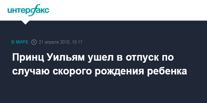 Москва. 21 апреля. INTERFAX.RU - Герцог Кембриджский Уильям взял отпуск на период со вторника по 1 июня, чтобы побыть рядом с супругой Кейт, которая в ближайшее время готовится к рождению второго ребенка, говорится в заявлении Кенсингтонского дворца.