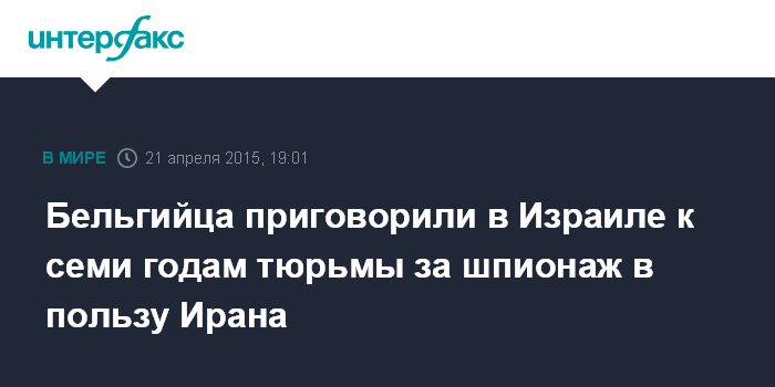 Москва. 21 апреля. INTERFAX.RU - Окружной суд израильского города Лод приговорил бельгийского подданного к семи годам тюремного заключения за шпионаж в пользу Ирана, сообщают во вторник западные СМИ.