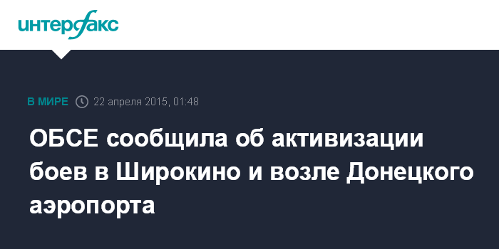 Москва. 22 апреля. INTERFAX.RU - Представители Специальной мониторинговой миссии (СММ) ОБСЕ в Украине зафиксировали обострение ситуации в поселке Широкино и вокруг Донецкого аэропорта. Об этом говорится в отчете СММ за 20 апреля.