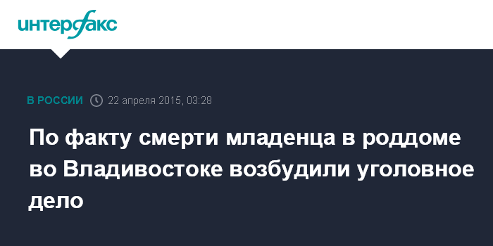 Москва. 22 апреля. INTERFAX.RU - Во Владивостоке возбуждено уголовное дело по факту смерти младенца при родах в одном из родильных домов города.