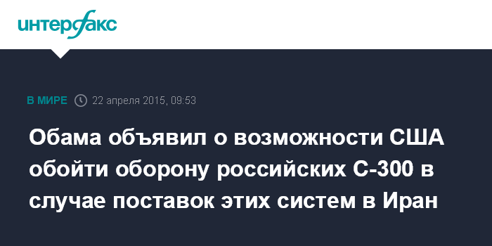 Москва. 22 апреля. INTERFAX.RU - Поставка в Иран российских зенитных ракетных систем С-300 не станет преградой для американских военных в случае проведения операции против Тегерана, заявил президент США Барак Обама.