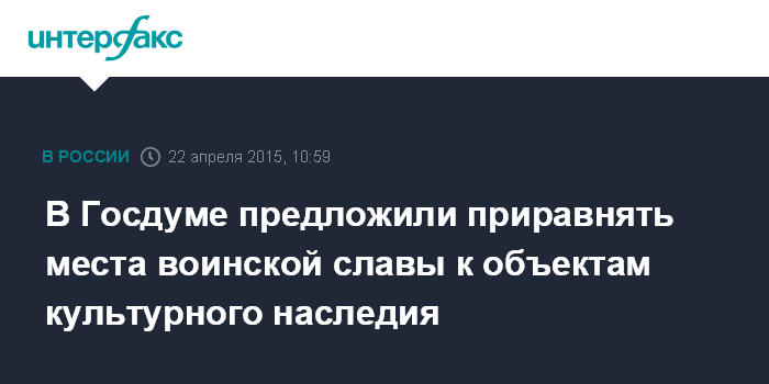 Москва. 22 апреля. INTERFAX.RU - В Госдуму внесен законопроект, предлагающий ввести новый вид объектов культурного наследия - места воинской славы.