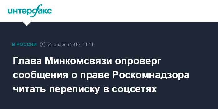 Москва. 22 апреля. INTERFAX.RU - Министр связи и массовых коммуникаций Николай Никифоров назвал передергиванием информацию о якобы появившихся полномочиях Роскомнадзора читать личную переписку пользователей российских соцсетей.