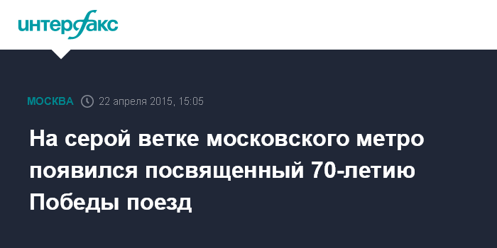 Москва. 22 апреля. INTERFAX.RU - Торжественный запуск нового именного поезда, посвященного 70-летию Победы в Великой Отечественной войне, состоялся в среду на Серпуховского-Тимирязевской линии Московского метрополитена.