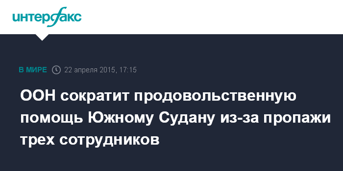 Москва. 22 апреля. INTERFAX.RU - Всемирная продовольственная программа (ВПП) ООН объявила об исчезновении трех своих сотрудников в Южном Судане, в связи с чем организация приостанавливает свою деятельность в некоторых районах этой страны, сообщает в среду Associated Press.