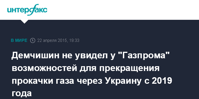 Москва. 22 апреля. INTERFAX.RU -У "Газпрома" нет технической возможности прекратить прокачку газа через Украину с 2019 года, заявил журналистам глава Минэнергоугля Украины Владимир Демчишин журналистам в рамках конференции HIS CERAWeek.