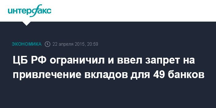 Москва. 22 апреля. INTERFAX.RU - Банк России на текущий момент ограничил привлечение вкладов или ввел запрет на привлечение вкладов для 49 российских банков, сообщил зампред ЦБ РФ Михаил Сухов в эфире телеканала "Россия 24".