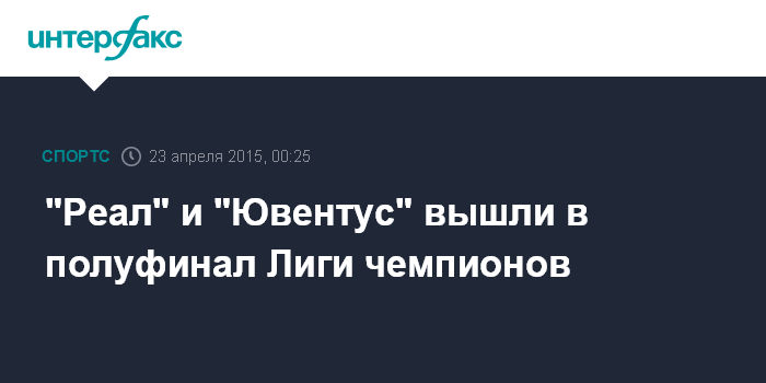 Москва. 23 апреля. INTERFAX.RU - Мадридский ФК "Реал" и туринский "Ювентус" стали обладателями путевок в полуфинал Лиги чемпионов УЕФА.