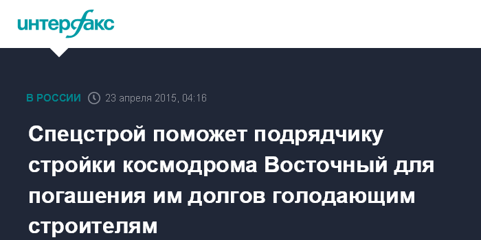 Москва. 23 апреля. INTERFAX.RU - Спецстрой России поможет своему подрядчику на строительстве космодрома Восточный в Амурской области погасить долги по зарплате объявившим в среду голодовку рабочим компании-субподрядчика ООО "Стройиндустрия-С", сообщила пресс-служба ФГУП "Дальспецстрой".