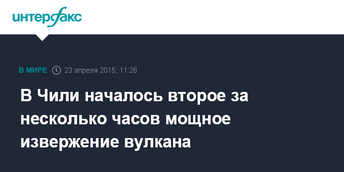 Москва. 23 апреля. INTERFAX.RU - На юге Чили зафиксировано второе за несколько часов сильное извержение вулкана Кальбуко, передает в четверг агентство EFE.