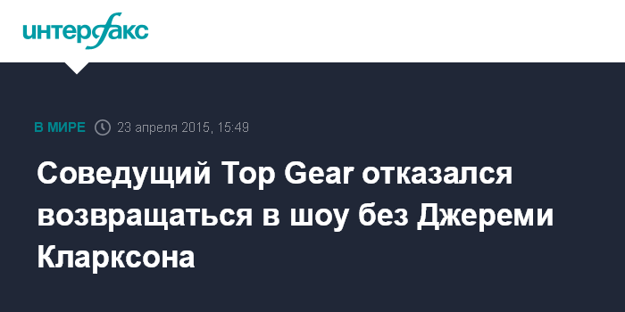 Москва. 23 апреля. INTERFAX.RU - Один из ведущих автомобильной передачи Top Gear Джеймс Мэй в интервью The Guardian исключил возвращение в программу без своего коллеги Джереми Кларксона.