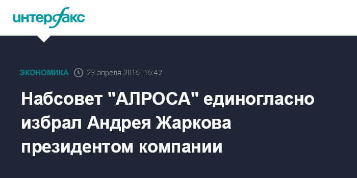 Москва. 23 апреля. INTERFAX.RU – Наблюдательный совет алмазодобывающей "АЛРОСА" единогласно избрал бывшего замруководителя Гохрана Андрея Жаркова президентом компании, передал корреспондент "Интерфакса" с заседания набсовета.