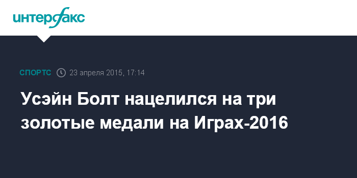Москва. 23 апреля. INTERFAX.RU - Шестикратный олимпийский чемпион, восьмикратный чемпион мира в беге ямайский спринтер Усэйн Болт заявил, что на Олимпиаде-2016, которая станет последней в его карьере, он намерен выиграть три золотые медали, в том числе и с рекордом мира.
