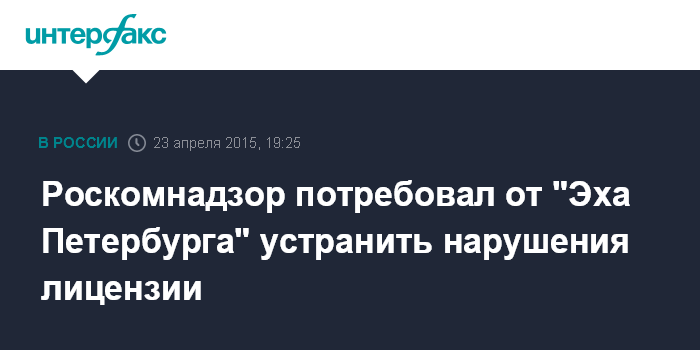 Москва. 23 апреля. INTERFAX.RU - Роскомнадзор вынес предписание "Эху Петербурга" с требованием устранить нарушения условий лицензионного соглашения; радиостанция обязана отчитаться перед ведомством сразу после майских праздников.