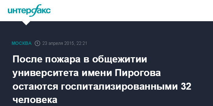 Москва. 23 апреля. INTERFAX.RU - В больницах Москвы остаются на лечении 32 человека, пострадавшие в результате пожара в общежитии Российского госуниверситета им.Пирогова.