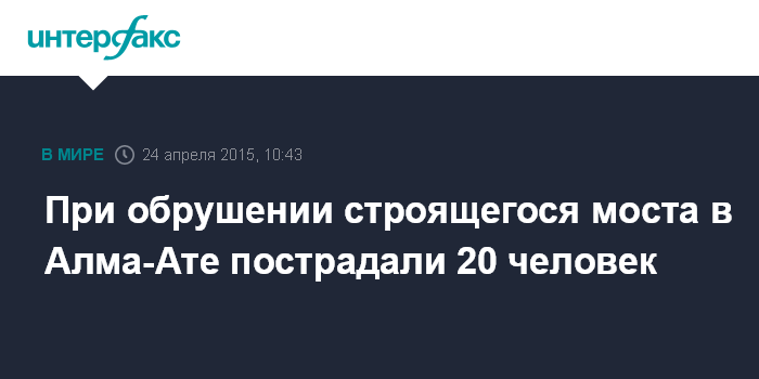 Москва. 24 апреля. INTERFAX.RU - По предварительным данным, при обрушении строящегося моста в Алма-Ате в пятницу пострадали 20 человек, сообщили агентству "Интерфакс" в городской службе спасения.
