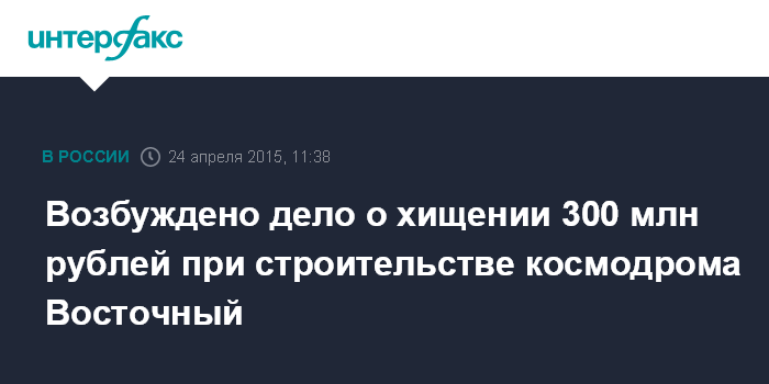 Москва. 24 апреля. INTERFAX.RU - В Амурской области возбудили уголовное дело по факту хищения 300 млн рублей при строительстве космодрома "Восточный".