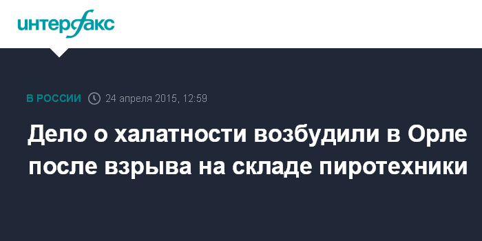 Москва. 24 апреля. INTERFAX.RU - Следственные органы возбудили второе уголовное дело после взрыва, прогремевшего в четверг на складе пиротехники в Орле, сообщила "Интерфаксу" старший помощник руководителя управления СКР в Орловской области Юлия Дорофеева.