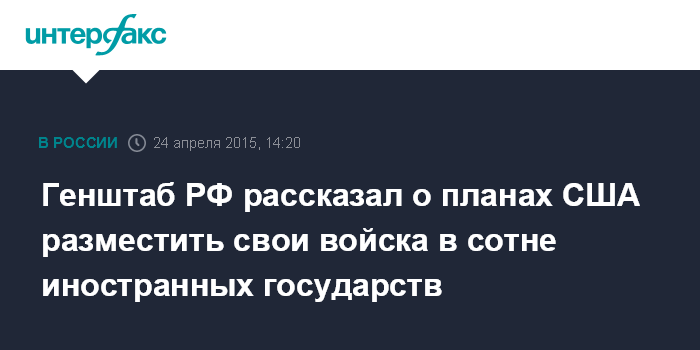 Москва. 24 апреля. INTERFAX.RU - Пентагон в интересах обеспечения благоприятных условий для развертывания группировок войск планирует расширение системы передового базирования своих вооруженных сил, сообщил в пятницу начальник Главного управления генштаба ВС РФ, генерал-полковник Игорь Сергун.