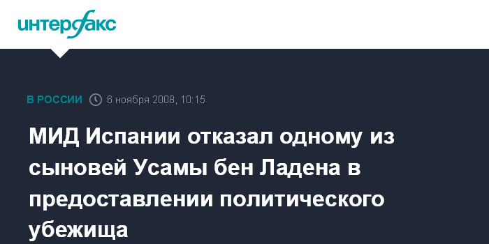 Москва. 6 ноября. INTERFAX.RU - Саудовскому подданному Умару Усаме бен Ладену, одну из сыновей Усамы бен Ладена, без объяснения причин отказано в получении политического убежища в Испании, сообщили американскому телеканалу Си-Эн-Эн представители испанского министерства внутренних дел.
